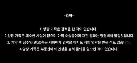 이후 부동산 측과 양팡측은 다른 매물을 보기위해 수차례 만남을 가졌고, 계약은 파기된것으로 알고있었음.