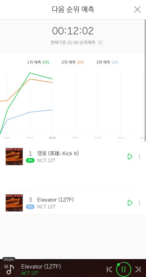 이게 우리 영웅이 순위 예측 그래프였는데 5분에서 6분 사이 뚫고 올라는 거 보이지??? 이게 스밍리스트에 맞춰서 돌리면 다들 그맘때쯤 영웅차례여서 그래 그리고 10분 그래프부터 떨어지는 모습이 보이는데 그게 다른 수록곡으로 넘어가서 그런거고 점점 떨어지는 이유가 차트 반영이 한 곡 당 한시간에 1번씩밖에 안돼서 그래