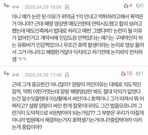 +) 한마디만 더 하고싶은데 뭣도 모르면서 양팡쉴드친다 대깨팡 이런말 하는사람있던데 쉴드를 친건 저 위의 내용처럼 양팡은 사기꾼이아니다 라는말이고 법적으로 양팡이 과실이있던말던 우리는 신경쓸게 아님 저건 지극히 개인적인일이고 그걸 공론화시킨이유도 난 사실 잘 모르겠음