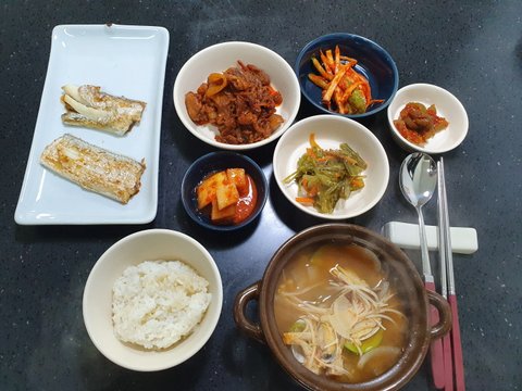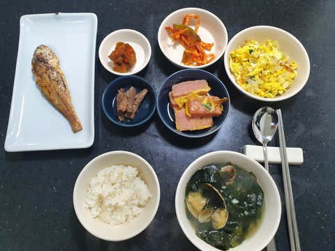 바지락미역국, 조기구이, 계란오믈렛 (+기타 반찬)