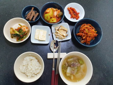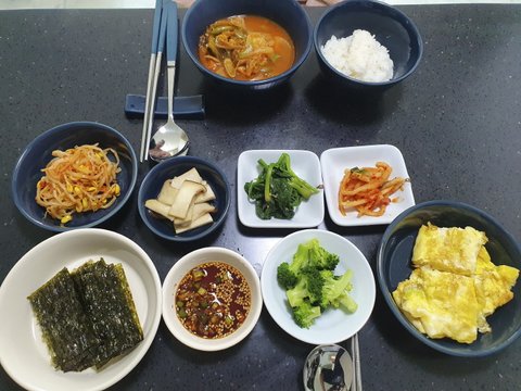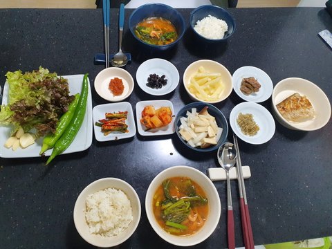 돼지고기김치찌개, 달걀말이, 콩나물무침, 버섯볶음, 브로콜리 (+기타 반찬)