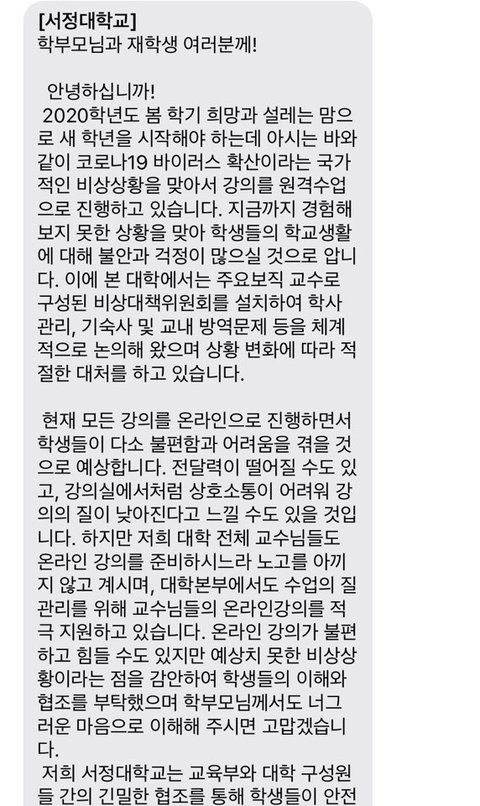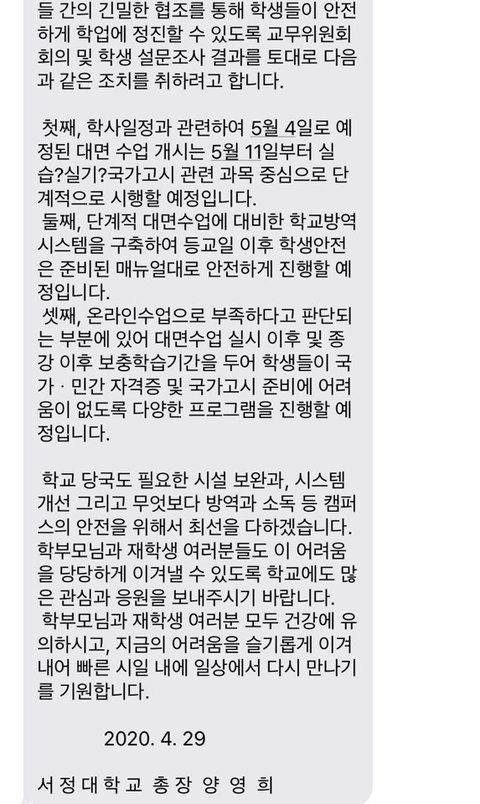 먼저, 서정대학교는 잠정적으로 4월 13일로 개강이 결정된 상태였습니다. 하지만 코로나 사태 악화로 인해 5월 4일로 개강 연기되었다는 공지가 왔습니다. 이 공지는 개강 6일 전인 4월 7일에 왔습니다. 상황을 지켜보느라 늦어지는 점 충분히 이해합니다. 하지만 전문대교협에서 4월 2일, 개강 연기를 권고하였고 어떤 이유에서였는지 5일이나 지난 후에 공지가 오게 되었습니다. 개강 6일 전에 알려준거면 충분하지 않느냐, 뭐가 문제냐 라고 생각하시는 분들도 있으리라고 생각이 됩니다. 하지만 학생들 입장에선 상황이 악화되는 그 5일 동안 이 시국에 학교를 가야 하나, 가야 한다면 기숙사는 언제 들어가야 하나와 같은 고민과 불안 속에서 시간을 보냈습니다.
