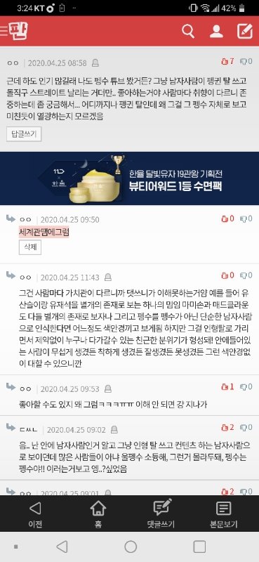 이쁘긴한데 너무 남좋얼이라 갠적으로 이쁘다고 생각한적은 없음..근데 그거랑 별개로 남초픽 유튜버라 억까 심하게 당하는건 안타깝긴함 ..