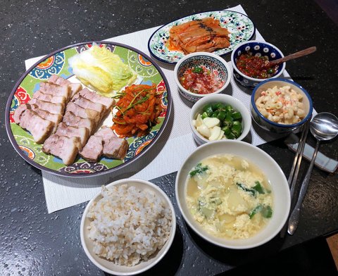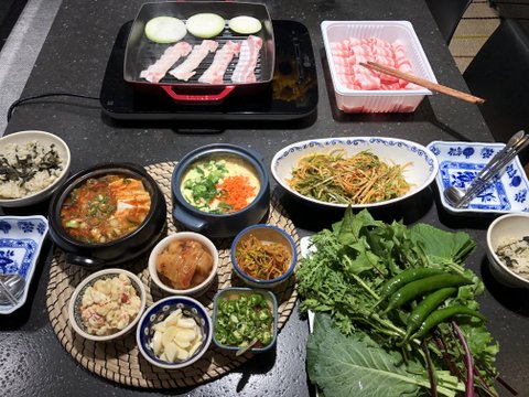 대패삼겹살 계란찜 된장찌개 쌈채소 파채 등등