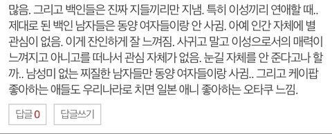 +) 아니 ㅋㅋㅋㅋㅋㅋ 나도 궁금해서 물어본거지 내가 누굴 후려쳐 ㅋㅋㅋㅋㅋ 다 유학갔다온 애들도 정신머리 제대로 박혀있는 백인남자들은 동양인 눈길도 안준다는데 근데 현실에선 다들 잘만 사귀니까 물어본거지 ㅈㄴ어이없네