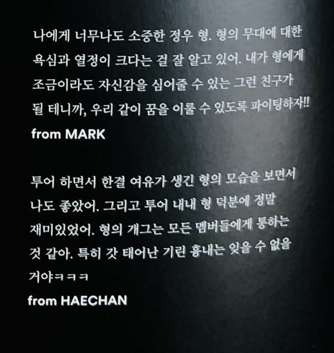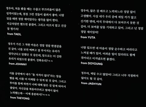 마크가 정우한테 자신이 조금이라도 자신감을 실어줄 수 잇는 친구가 되겟다고 쓴 부분에서 진짜 마크는 어떻게 사람이 그렇게 단단한 지 얼마나 올곧고 가치관도 뚜렷하고 생각이 깊은 사람인지에 대해 다시 느꼇고 태용이도 울 자격이 없다라고 말한거 언급하면서 정우에 대해 더 이해할 수 잇엇다고 말한 부분도 너무 ㅜㅜ 재현이더 짧지만 정우한테 가장 해주고 싶은말인 너무 걱정하지 않아도 될 거 같다고 햇을때 진짜 멤버들한테 너무 너무 고마웟어 다들 순수하고 여린 정우가 많이 힘들어하고 스트레스 받앗을 걸 공감해주고 이해해주고 알아주는거 같아서 아 참 이 새벽에 주책맞게 눈물 흘리며 주저리 주저리 써버렷네 김정우 제일 사랑해!!!!!