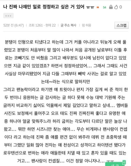 자꾸 일 터지기 전에 보여줬던 재민이 모습을 거짓같다고 치부 해버리는 애들이 몇몇 있는데 그렇게 까지 재민이 행동이 의심되고 못믿겠으면 그냥 탈덕하는게 맞다고 본다.....