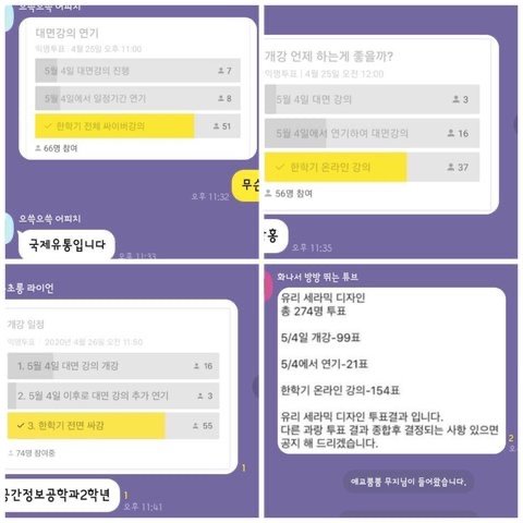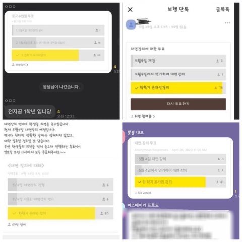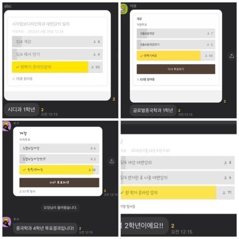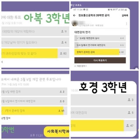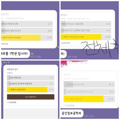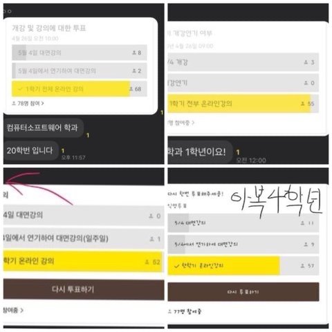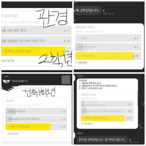 아래 사진들은 학과마다 대면강의에 대해 투표한 결과들을 모아둔 사진입니다.