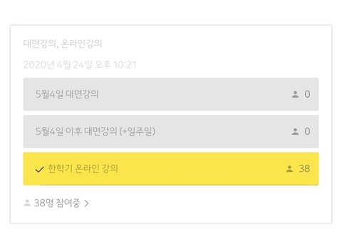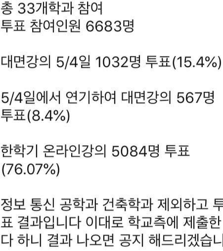6. 문자로는 실습+이론은 투표 후 진행한다고 왔었지만, 몇몇 과목은 투표의 결과는 반영되지않고 일방적으로 대면강의를 실시한다고 공지가 내려왔습니다.
