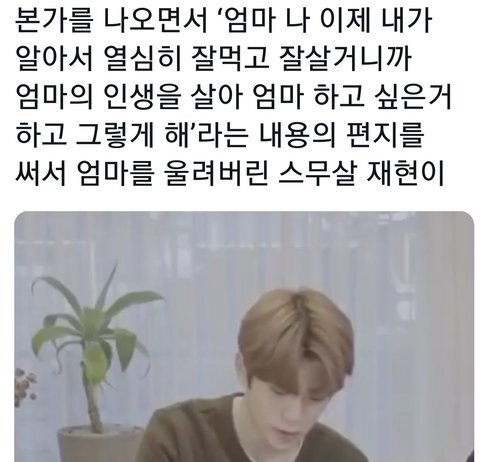 20살되자말자 엄마한테 자기 키우느라 인생 쓰셨다고, 이제 엄마가 아니라 한 여자와 한 사람으로서의 인생을 살길 바란다고 편지 쓰고 독립했던 재현과, 감동받아서 울어버린 어머니.