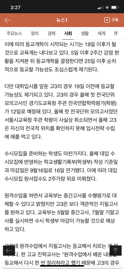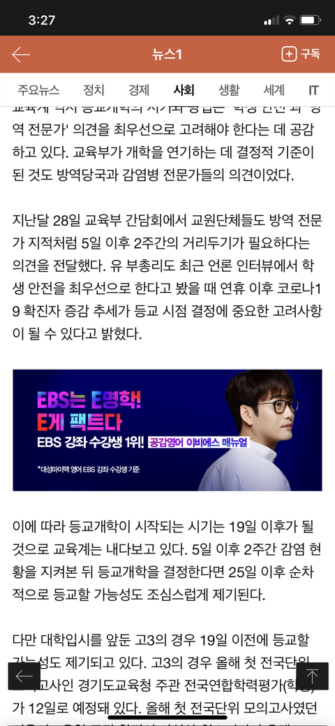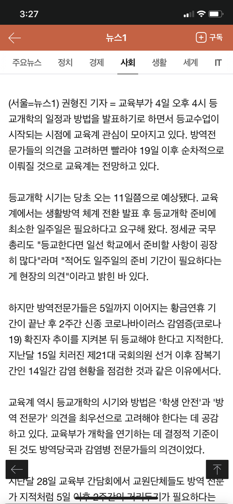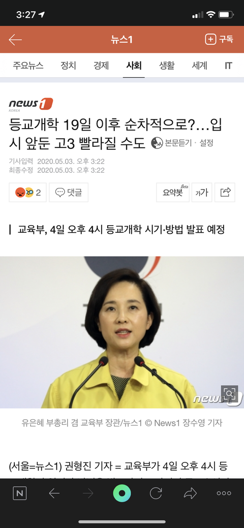 수정할게 어제까지만 해도 고3 개학이 11일에서 2~3일 밀린다고 했는데 오늘 뜬 걸로는 19일 이후에 개학 할 가능성이 높대 근데 또 고3은 19일 전에 개학 할거라는 전망도 조금은 있어.. 근데 이 여론 그대로라면 19일부터 고3 개학할 확률이 높은 듯