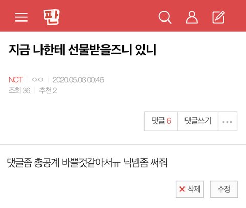 오늘 시간 넘 촉박했어서 내일은 35분쯤에 올릴게.. 많이많이 댓글달아줘ㅠㅠ 나 엔시티말도 돈쓸곳 없어ㅜㅜ