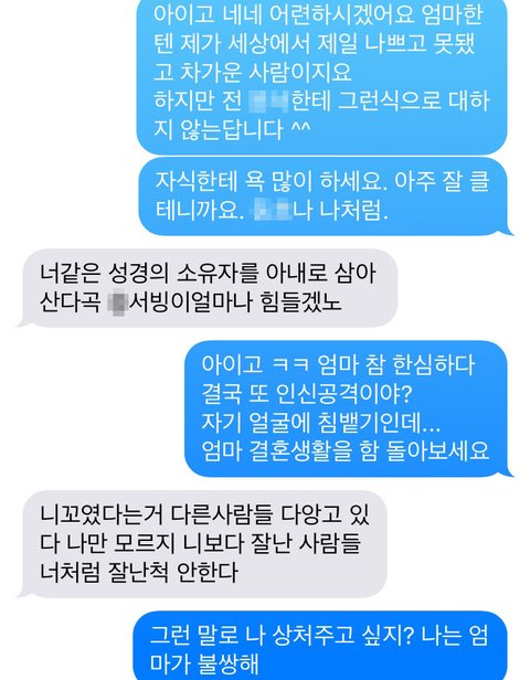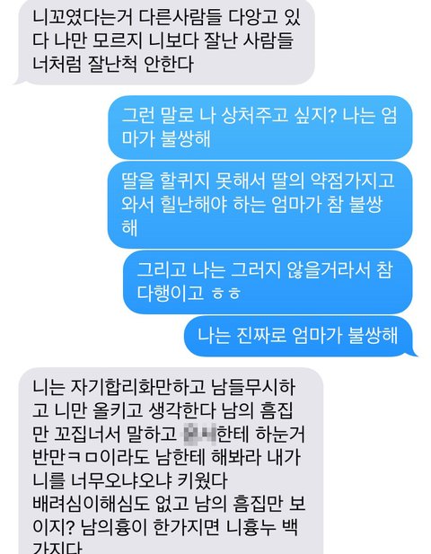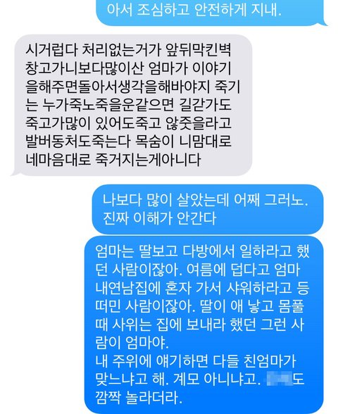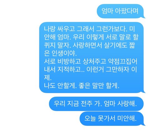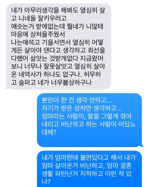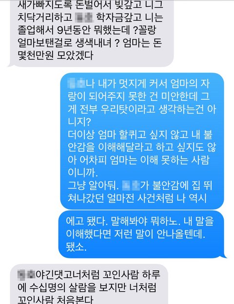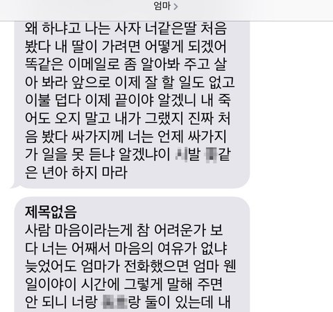 이 글 쓰면서 확인하니 엄마가 욕 문자를 보내셨네요.난생 처음 엄마로부터 받아보는 욕문자네요. 그래도 예전엔 이렇게 욕까진 안했는데 오늘은 정말 힘드네요...