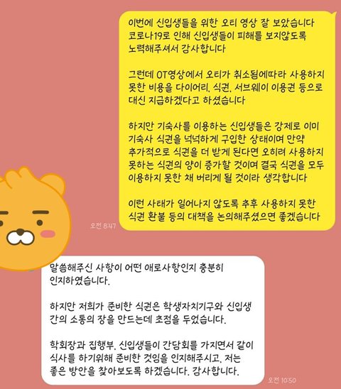 며칠 전 신입생들을 위한 OT 영상이 올라왔습니다.저는 그 영상을 보고 저처럼 기숙사를 신청한 학생들은 강제적으로 식권을 최대 300장 구매한 상태인데추가적으로 식권을 받게 된다면 다 사용하지도 못한 채 버리게 될것이라는 생각이 들었습니다.그래서 총학생회 오픈채팅방에 이에 대한 대응책을 여쭤보았고 첫번째 사진과 같은 답변이 오게 되었습니다.