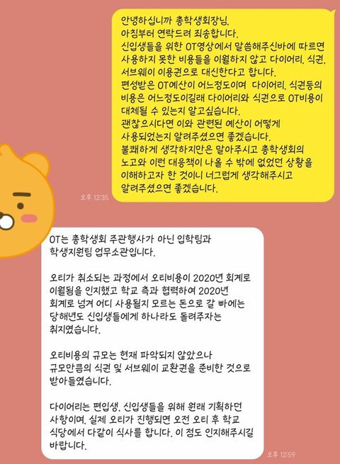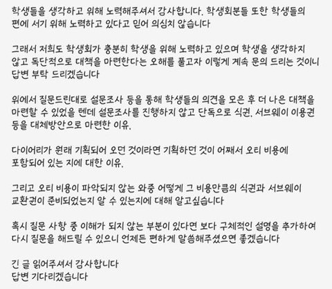 그 톡을 본 몇몇 학우들은 오티 비용이 어떻게 편성이 되었길래 식권, 다이어리, 서브웨이 이용권 만으로 대체가 가능한지에 대해 의문을 품었습니다.