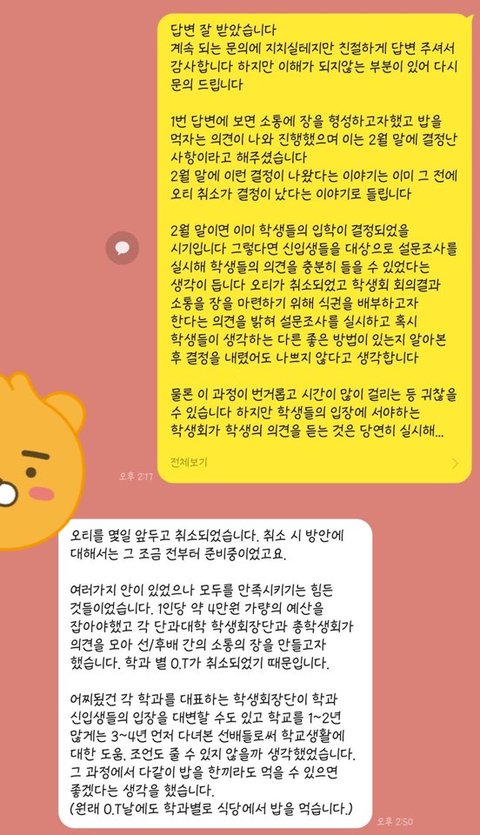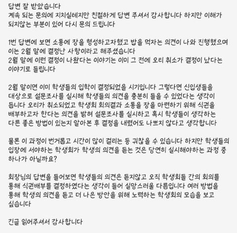또한 설문조사 등을 통한 새내기들의 의견을 듣지않은 채 결정을 내린 학생회를 이해할 수도 없었습니다. 그래서 다시 질문을 드리고 받은 답변이 세번째,네번째 사진입니다.