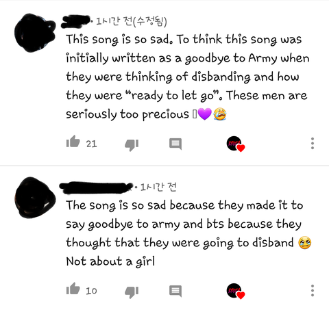 내가 너튭에서 리액션 영상 되게 자주 보거든 근데 오늘 Let Go 리액션 영상 댓글 보다가 저 사진처럼 이 노래가 방탄이 해체 생각하고 만든 노래라서 슬프다 이런 댓글이 두개나 제일 상단에 있는거야 난 처음 듣는 소린데 진짜야?? 팬톡이 제일 정확할 거 같아서 물어보러 왔어!