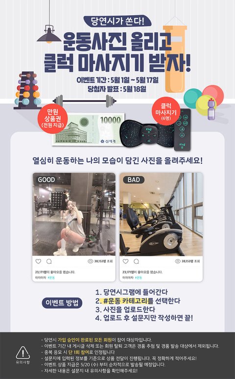 헬린이들을 위한 이벤트임 ㅋㅋㅋㅋㅋㅋㅋㅋ일단 운동할때 사진찍은거 다하나씩 있는거 앎ㅋㅋㅋㅋㅋㅋㅋㅋㅋㅋㅋㅋ그거 올리면 만원 걍 준대용 거기서 추첨으로 클럭 준다는데 밑본임 ㄱㄱ