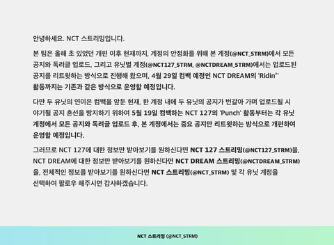 스밍팀 개편은 펀치 활동 부터인데 그때부터 드림팀/127팀으로 계정 나눠서 하기로 했음 이글은 라이딩 나오기 전에 올라온 공지야