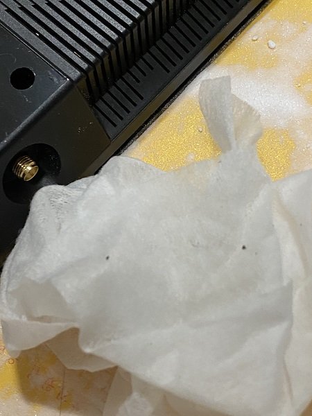 2. 제품 개봉 및 바퀴벌레 발견*29일 20시,공유기 설치를 위해서 공유기 내부비닐포장을 제거.비닐포장을 뜯으니 공유기 본체 외부 안쪽에 확인할 수 없었던 얼룩들 노출.작은 벌레 사체들, 검은깨 같은 가루, 바퀴벌레 다리도 본체외부에서 떨어짐.불안감이 엄습하여 본체를 직접 내부 개봉.뚜껑을 살짝 열자마자 손톱만한 바퀴벌레 사체가 하나 떨어짐.
