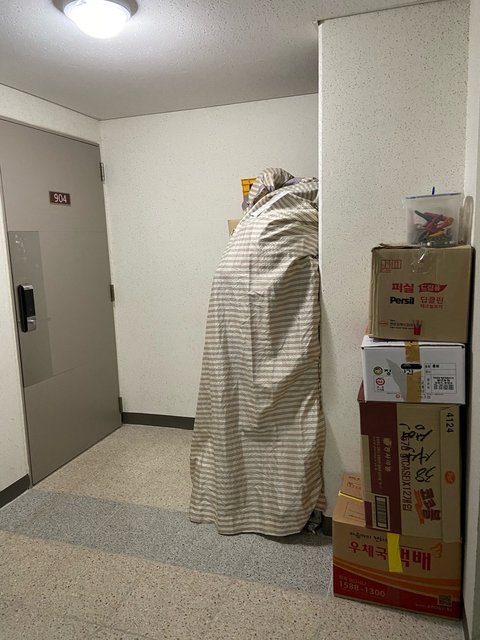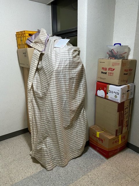 갑자기 집 앞에 떡하니 쌓여있는 정체 모를 짐들... 지금 월세로 살고 있는 집주인이 놓고간 것들이라 하는데요. 한 두 박스도 아니고, 거의 장롱만한 크기로 쌓여진 짐들이 집문을 열면 제일 먼저 보입니다.