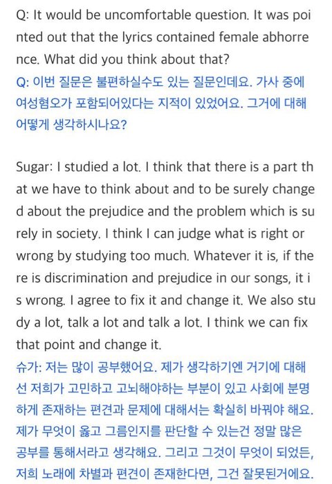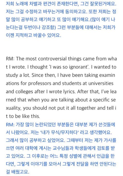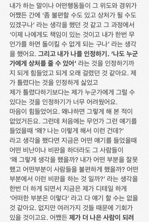 더 나은 사람이 되게 해준거같아서 다행이라고 생각이 들때도 있어 그러니까 욕하고 방탄에 대해 그냥 맘 닫지말고 알아줬으면 좋겠어 팬들도 회사도 맴버들도 다 인정하고 사과하고 많이 노력했어 논란에 있어서 이렇게 까지 뼈저리게 인정하고 노력한 아티스트들이 있을까 싶을 정도로