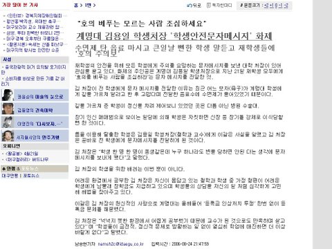 김 처장은 “학생 한 명 한 명이 동생같은데 누구 하나라도 변을 당하면 안된 다는 생각에 문자메시지를 보내게 됐다”고 말했다.