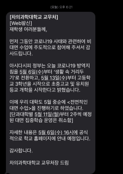 갑작스러운 소식에 저희 학교 학생들 사이에서 부정적인 반응이 퍼질 때쯤 곧바로 오후 6시 20분쯤 교무처에서 발송된 문자 알림이 떴습니다. 문자 내용은 사진과 같습니다.