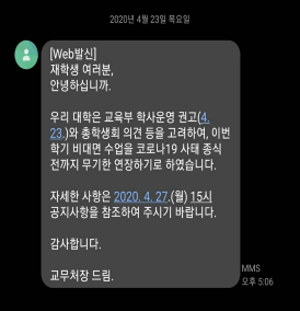 그러나 총학생회 측에서 보낸 공지 이후 학교는 돌연 말을 바꾸어 안내 문자를 보내왔습니다. 학생들의 주장에 따라 처음 안내되었던 ‘1학기 전면 사이버’강의가 아닌, ‘코로나 종식 전까지 무기한 연기’라는 표현을 사용하였습니다. 이러한 비대면강의에 대한 내용은 아래와 같은 문자로 학생들에게 전달되었습니다.
