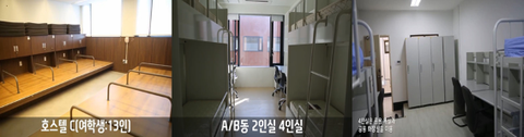 1-3. 위의 사진은 차의과학대학교의 기숙사 사진입니다. 기숙사별로 차이는 있으나 기본적으로 기숙사생들은 방안에서 4인이 함께 생활하게 됩니다. 호스텔의 경우 13명까지 단체생활을 하게 됩니다. 공동 샤워실에서는 10명 이상의 학생이 동시에 샤워를 하게 됩니다. 샤워실에는 칸막이조차 없습니다. 이밖에도 휴게실, 독서실, 카페 등 다양한 곳을 공유하게 됩니다.
