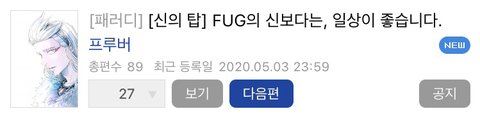 이 작품은 네이버 웹툰의 {신의 탑} 패러디 소설인 [FUG의 신보다는, 일상이 좋습니다.] 입니다. 작가님은 ‘프루버’ 작가님이시구요.
