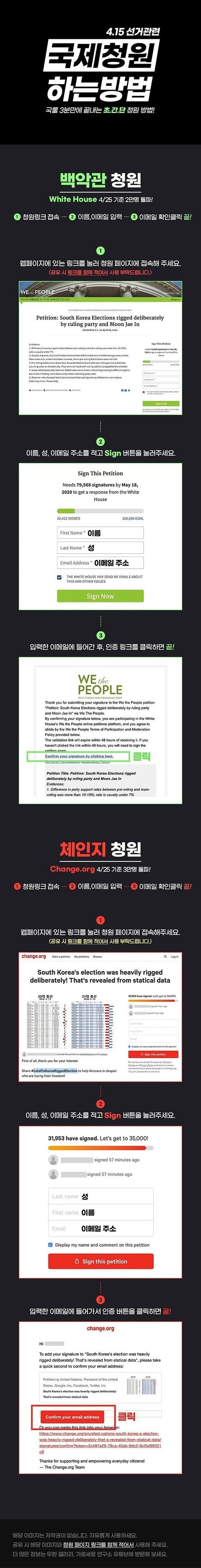 제발 한번씩만 해줘! 이번 부정선거에 관해서 한국에서조차 잠잠해서 백악관이 이 10만명 청원이 채워지길 바라고 있대. 그래야 개입할 명분이 생긴다고.