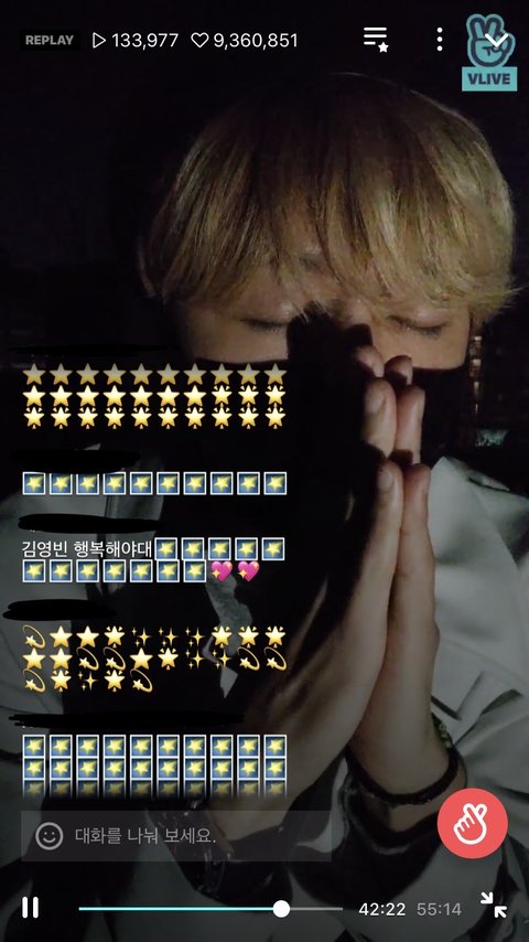 팬들이랑 별똥별보기로한 약속 지키려는데 알고보니 새벽4시에 떨어진다해서 진짜로 새벽 4시에 별똥별보자고 브이앱 켜줬다... 근데 결국 못봐서 팬들이 별로 댓글창 도배해줘가지고 댓글창보고 소원빌음.... 셒구 팬사랑 인정해야해