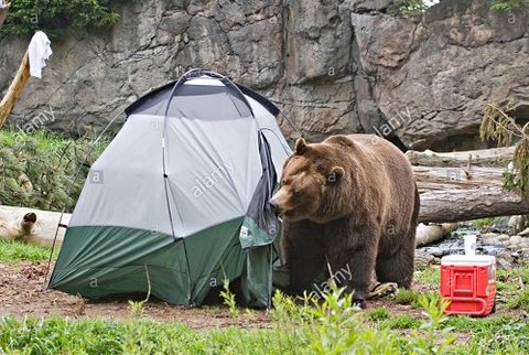 곰은 몇분 정도 집요하게 텐트를 잡아당겼고 결국 텐트가 쓰러지고 곰이 텐트에 들어왔습니다.