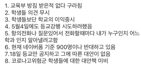 이 밖에도 학생들은 18일 등교를 진행할 시에 따라올 수 많은 문제들에 대해 걱정하고 있습니다. 그러나 전0대학교는 어떠한 대응방안도 발표하지 않은 채 18일 등교를 강행하겠다는 공지만 전달하고 있습니다. 위와 같이 중요 방안이 불충분한 현재 상황에서 18일 등교를 강행하는 것은 학생들을 위한 선택이 절대 아닙니다.
