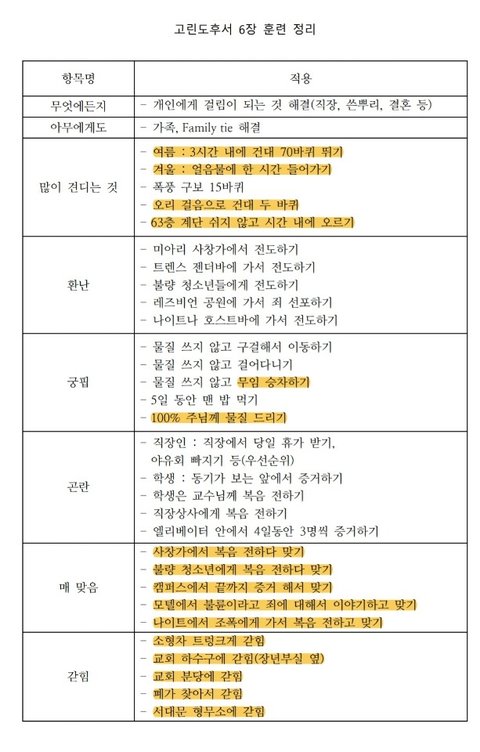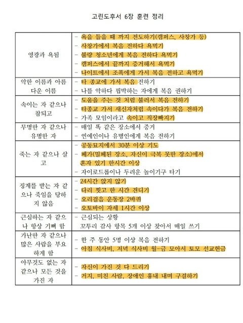 40도되는 여름에 3시간 내에 70바퀴 뛰기, 겨울에 얼음 물 한시간 입수, 쓰레기 곰팡이음식 먹기, 사람이 토 한것을 맨손으로 치우고 얼굴에 바르기, 사창가에서 욕 들을때까지 전도하기, 공동묘지에 묶어놓고 매맞기, 하루에 잠 한시간 자기, 폐가에 혼자있기 등등