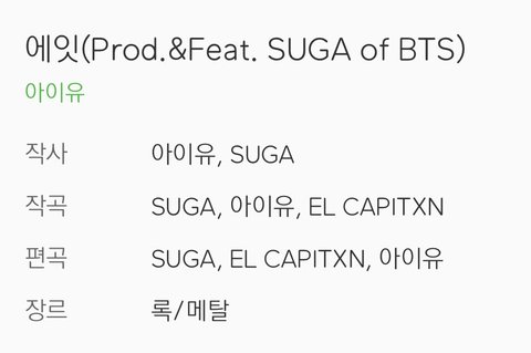 슈가도 작곡 편곡 피아노등에 모두 메인(더 비중이 큰사람 이름이 맨 앞에 나옴)으로 참여해서 한국 대중에게 프로듀서로의 입지를 확고하게 해주는 계기가 될것 같음