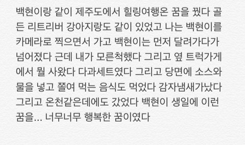 오늘 엑몽꾸고 비몽사몽 난리부르스로 적어놨다가 방금 생각나서 똑바로 다시 고쳐썼다 슈발 꿈속에서 나 변백현이랑 쩨쭈똥으로 힐링여행가서 온천도가고 트럭가게에서 과자들도 사먹고 이름모를 국수도 먹고 내가 국수 어케하는지 모르니까 옆에서 알려주고 그랬다