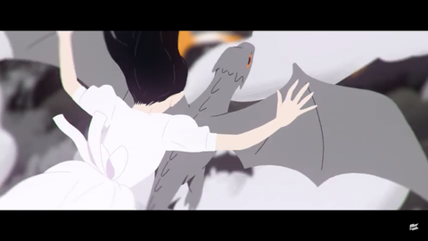 여자아이는 현실에 존재하지 않는, 환상 속 이동 수단인 용을 타고 서로 반대 방향으로 날아가고 있습니다.