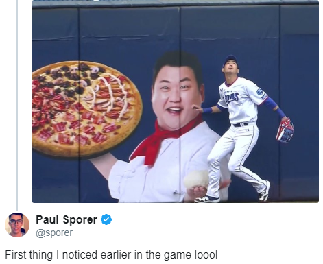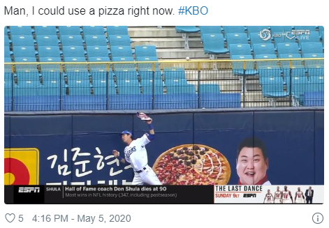 경기장 내 김준현이 등장한 피자 광고판이 생중계 됐기 때문.