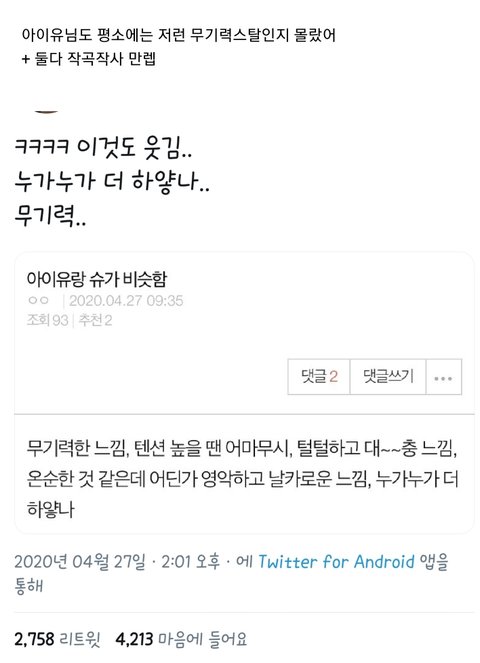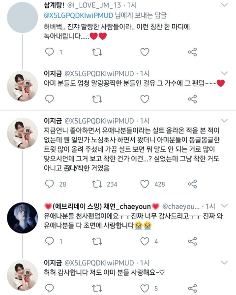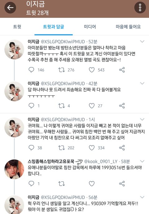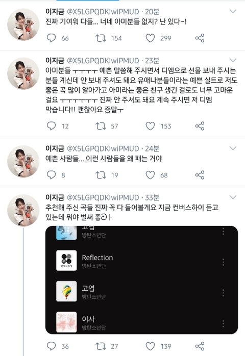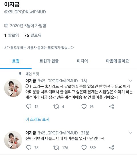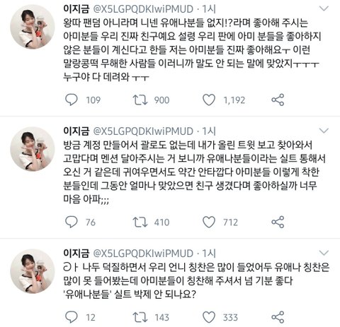 진짜 공감성 수치 오지게옴...언제는 왕따팬덤 아니라면서 지들 스스로 왕따팬덤 워딩쓰고 왕따팬덤 탈출ㅇㅈㄹ하고아이유 팬계정인척 하면서 아미칭찬함ㅅㅂ..계정 만든 날짜 보면 5월..이것보다 훨신 많은데 갯수제한때문에 못올림 그리고 유애나한테 예민한워딩 영악하다 라는 말로 모에화시켜서 유애나들도 이것때문에 빡쳤던데 일부 초딩아미들 좀 집에서 구몬이나 풀었으면 좋겠음