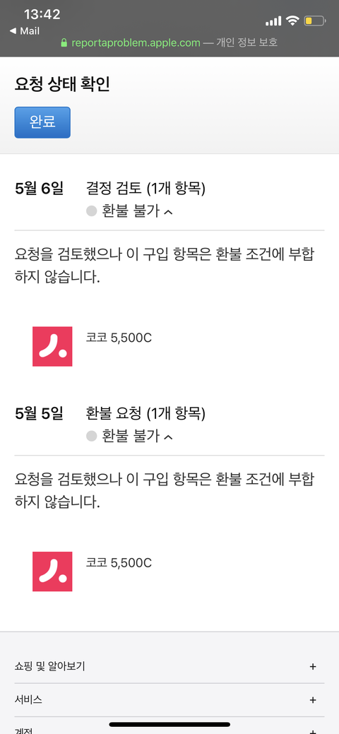 내가 사려는 건 8,800원이라 5,500코코로 사려고 했는데 오천오백코코가 그냥 5,500원이었어. 오천오백원을 구천원 주고 샀음.. 사고싶은 것도 못 사고 걍 환불하려는데 시즌에서 애플에 문의하래. 애플에 문의해서 환불 신청했더니 환불 불가래. 이의제기 했음. 나는 사용 안할거라고.. 근데 또 환불 불가.. 문의했더니 애플에서 최종으로 환불 불가라고 이의제기도 못하고 환불 불가인 이유도 알 수 없고 걍 할 수 있는 게 없대 ㅋㅋ 난 쉽게 환불될 줄 알았는데 구천원 날림ㅋ.. 애플 대기업이면서 왤케 쪼잔하게 굴어 애플에 없던 정 다 떨어짐.. 아이폰 쓰는게 후회되는 뻥안치고 ㄹㅇ 만번째 순간이다.. 담엔 무조건 삼성쓴다...