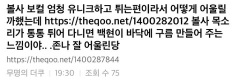 밑에 백현이 볼사한테 맞춰서 목소리 살포시 얹었다는 말 진짜 ㅇㅈ임 변백현 진심 엑소 노래처럼 진짜 치고 나오면서 부를 수도 있고 본인 솔로곡처럼 리듬 ㅈㄴ나눠서 느낌살리게 부를 수도 있는데 이번에는 진짜 말랑말랑하게 화음 넣고 저음 내는데 ㅅㅂ이건 뭐 좋아서 뒤지라는 뜻인 듯