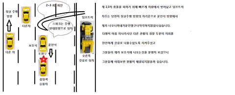 4월 27일 차장님과 외근하러 다녀오는길에 오후 4시 서울외곽순환도로 구리 휴게소를 지나 퇴계원 IC로 빠지는 길에 5차선에서 정주행하고 있던 저희 차는 나란히 4차선에서 달리던 덤프트럭이 차선변경을 시도하였고 저희가 타던 차량은 스파크 차량이라 덤프가 못봤는지 그대로 밀고 들어와서 저희 차는 5차선에서 그대로 회전하여 3차선에서 정차했습니다. 그 상태에서 주행하고있던 검정색 승용차와 충돌하였고 2중 추돌 사고가있었습니다. 사고 이후 가해자 차량인 덤프 트럭 차주는 보조석에 앉아있던 저를 운전자라며 억지를 부리고있었고 저희 스파크 차량은 회사 차지만 보험은 차장님 이름으로 개인 보험으로 가입이 되어서 과실 비율이 아직 인정이 안되었고 사고경위 파악중이지만 만약 제가 운전한걸로 누명을 덮는다면 무보험으로 처리가 되어 제가 보상을 해야할거같은 억울한 상황에 처해 있습니다. 만약 그 상황을 목격하셨거나 블랙박스가 있으신분은 010-2532-6880으로 연락 부탁드리겠습니다. 그에 상응하는 사례비 드리겠습니다. 한번만 도와주세요...