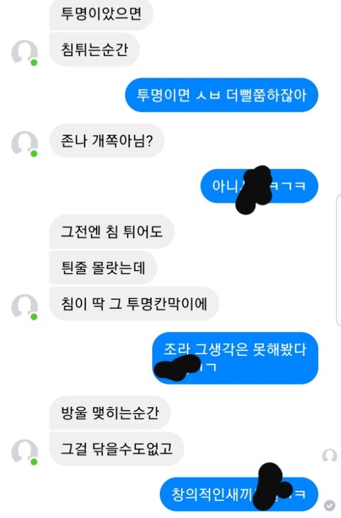 나는 눈마주치면 뻘쭘 이런거 생각했는데 내친구 왈 침튀면 개뻘쭘 + 어 ㅅㅂ 설마 투명인가했는데 우리학교 투명임 ,,,ㅋㅋ미친 이제 웃을일이 아니다,,,조카 내얘기였네 내 친구 새끼도 투명이면 좋겠다 보고있나?