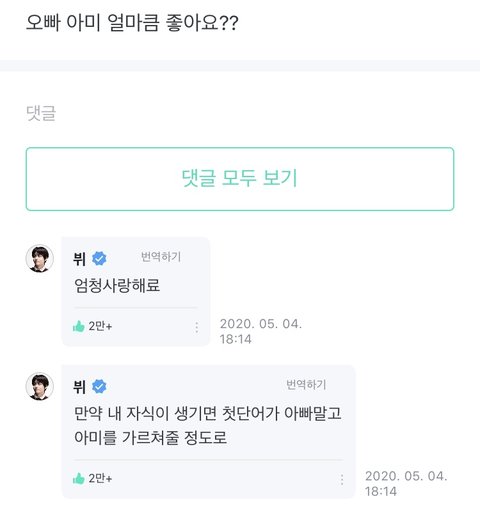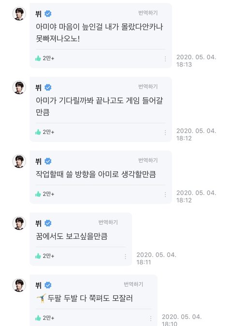 뷔가 팬들이 올려주는 글들 보면서 짓는 표정