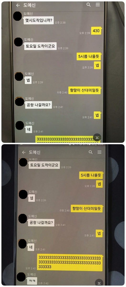 유부남,유부녀인 두 사람은 동문회 5년차 선후배로, 남자가 해외체류중인 가족 만나러 한달 머무르던 중에 둘이 카톡 주고받으면서 귀국에 대해 나눈 카톡 대화입니다.두 사람은 333 이란 숫자를 무슨 뜻으로 주고 받았을까요?,
