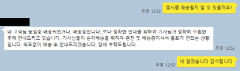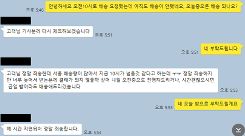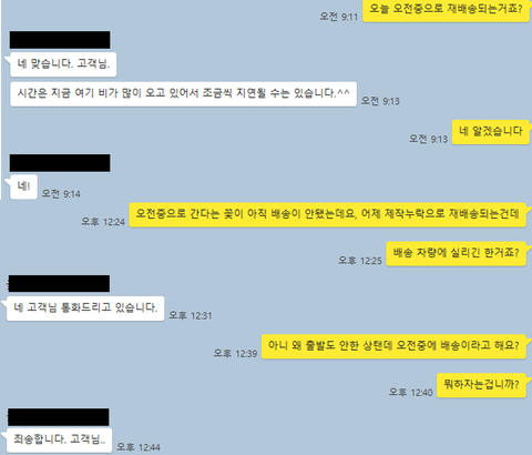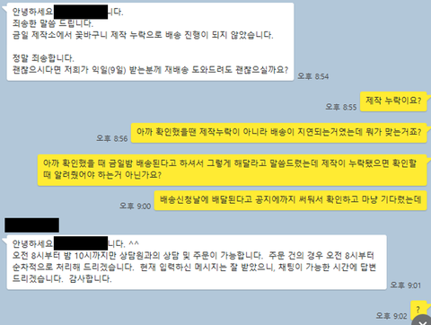 아침 10시로 주문예약 했는데 저녁시간이 되어도 꽃 받았다는 연락이 안오길래 꽃집 톡으로 연락했더니 밤 10시이후에 배달해도 되냐더라구요,