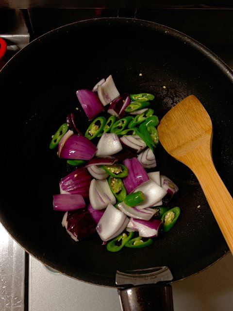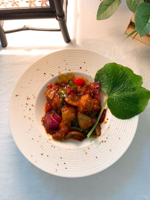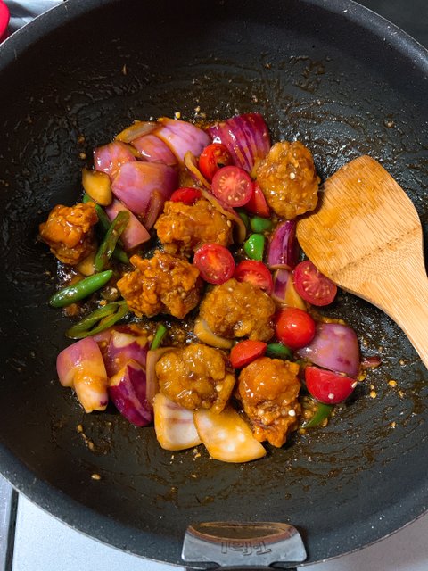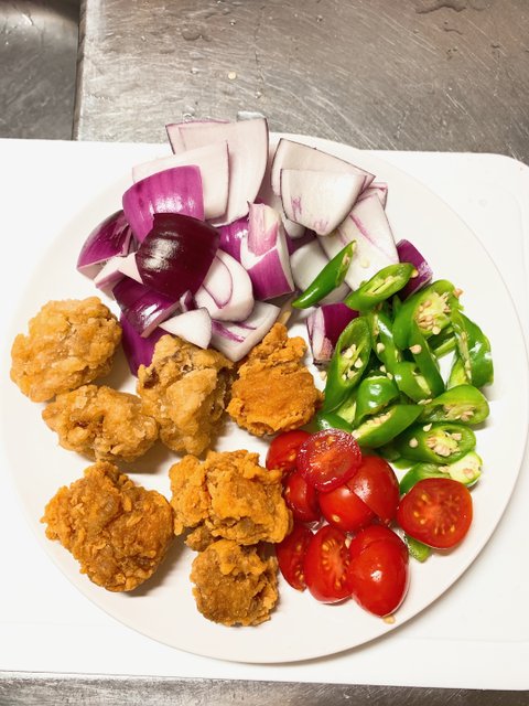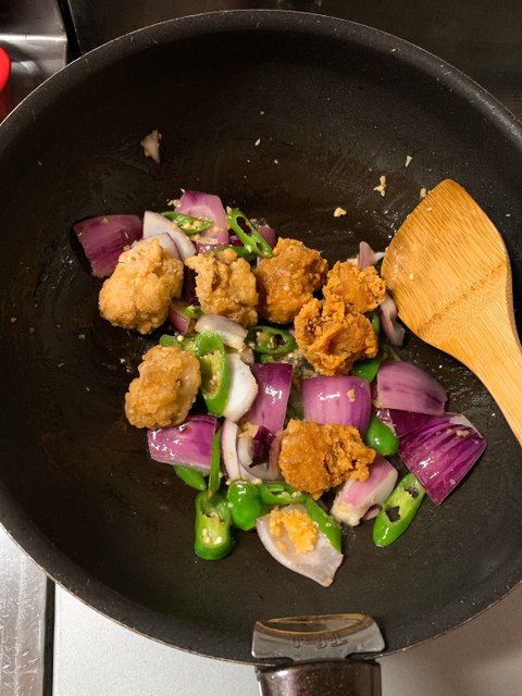 그런 다음 치킨을 다른용기에 옮겨 놓고 센불에 야채가 살짝 잠길 정도로 기름을 두르고 볶아주다양파가 투명해지면 마늘과 미리 데워 놓은 치킨을 넣고 볶아주고볶아지고 있는 치킨야채에 모두 넣는다.