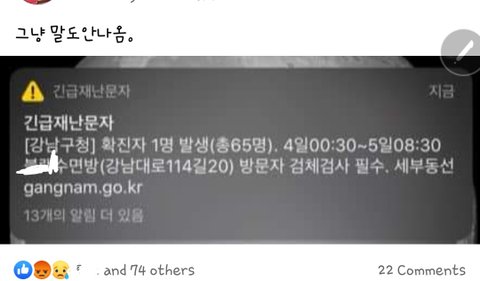 그리고 아직 검사를 안 받은 분들도 꼭 자진 해서 검사를 받길.. 어쩌면 이 글을 보고 있는 당신클럽이나 술번개든 어디든 우리가 봤을 수도 있는 데, 진심으로 하는 충고에요.자신만이 아닌 같이 사는 부모님 또 여러분들의 소중한 사람들을 위해서라도 코로나 전파는 꼭 막아야 합니다.자칫 본인의 이기적인 생각이 더 큰 파장을 일으킬 수 있다는 점 명심 하셔야 되요.